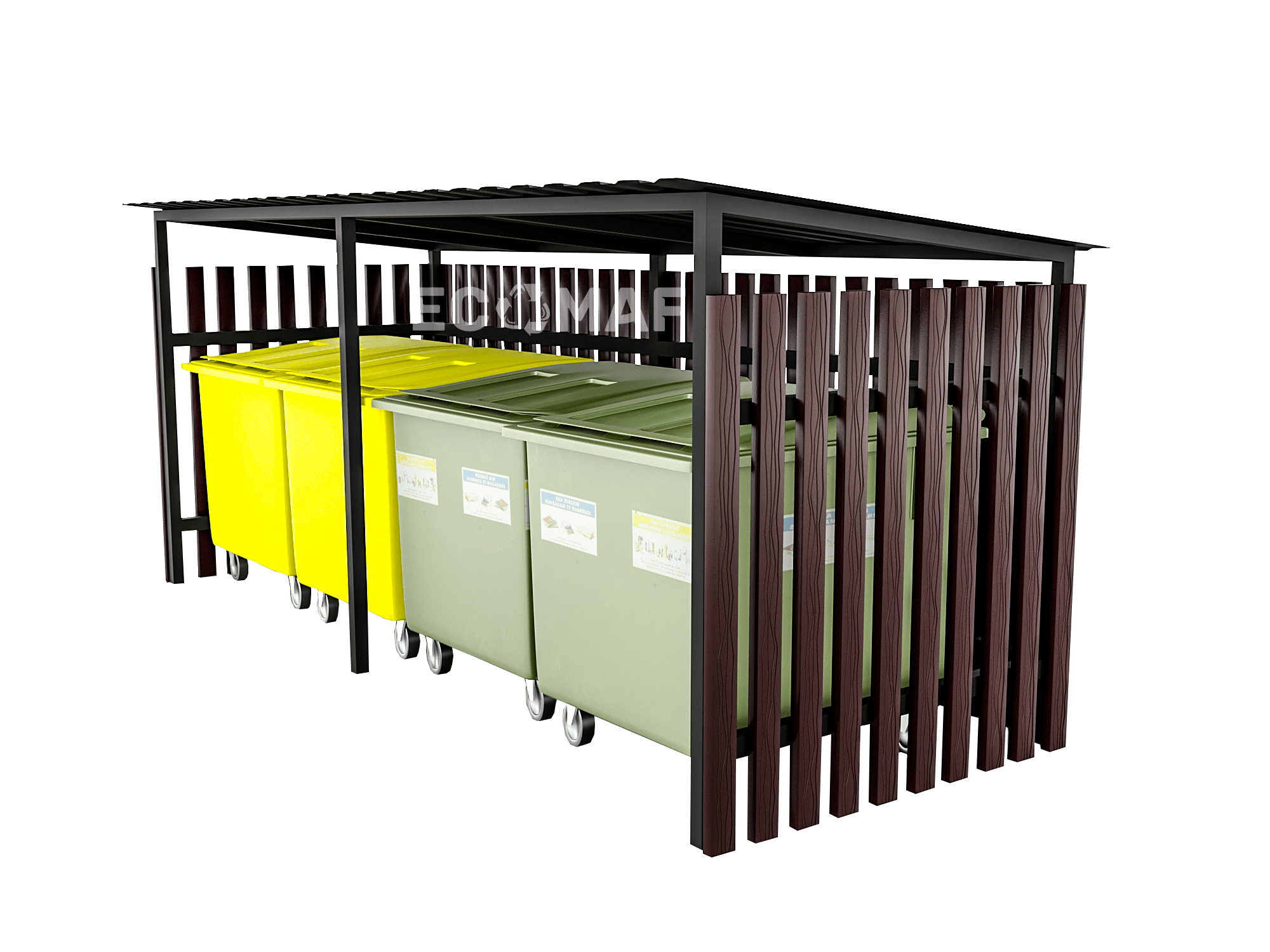 Образцы всех конструкций представлены на сайте. Размеры указаны для примера и изменяются по запросу под количество и габариты баков и контейнеров. Стены, навесы и каркасы павильонов можно окрасить в любые цвета по вашему выбору.